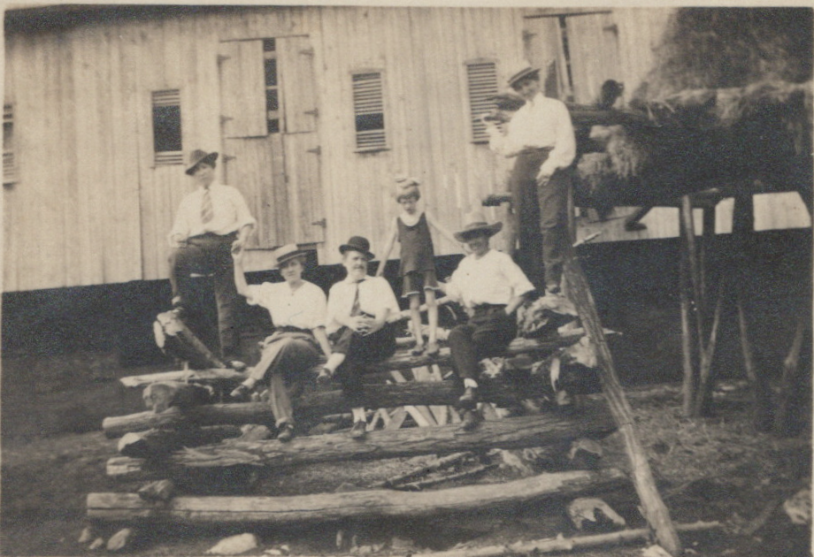 Unknown folks pictured in front of the big white barn at Glencoe Farm, circa 1910