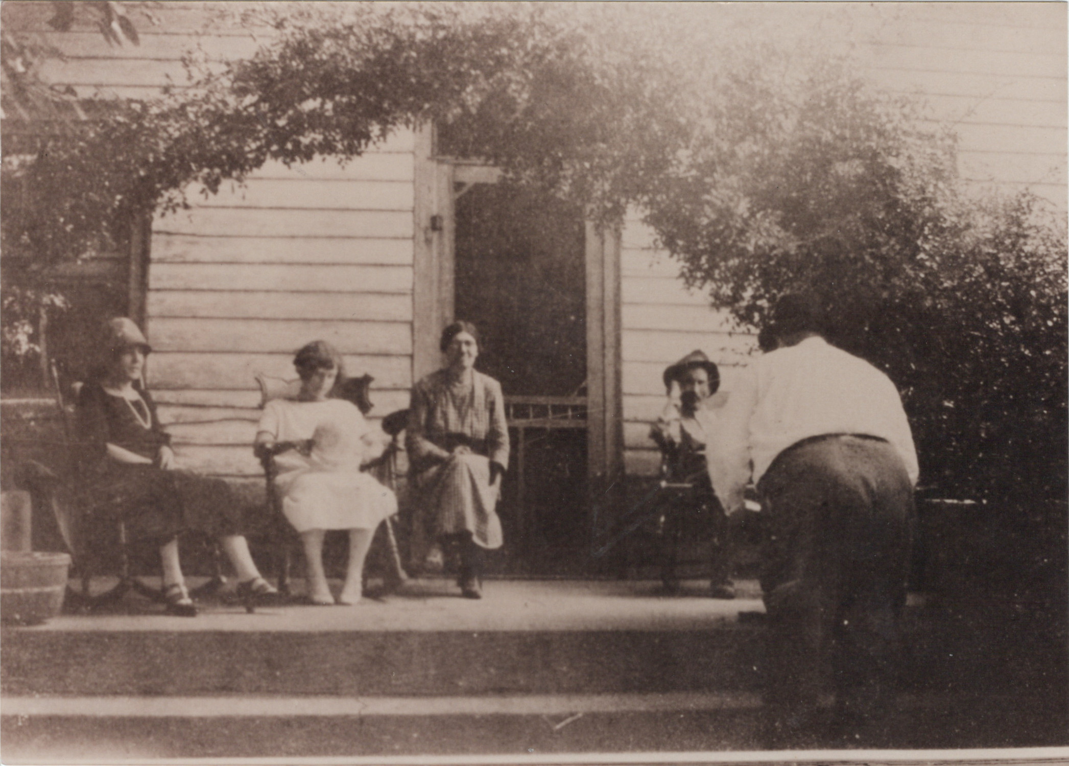 "Grandma Mag" (center), Elizabeth (center left) holding daughter Peggy, and Ernest Faulkner McDonald (center right)<br/>on the porch at Glencoe Farm in 1926