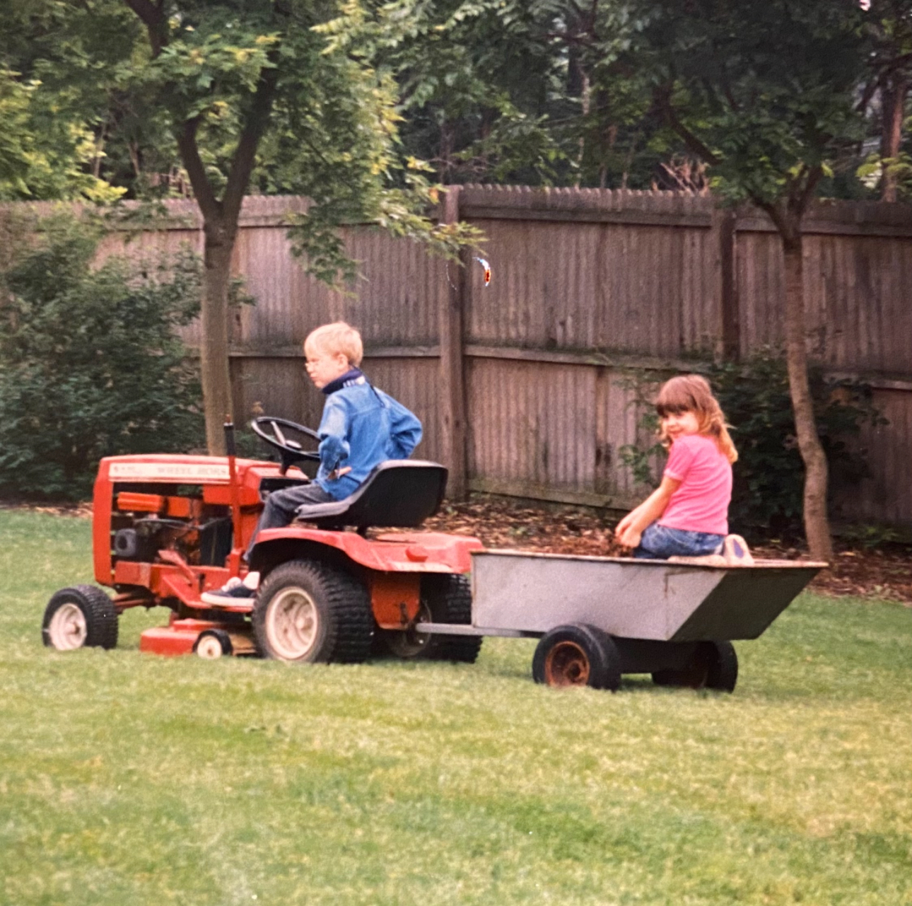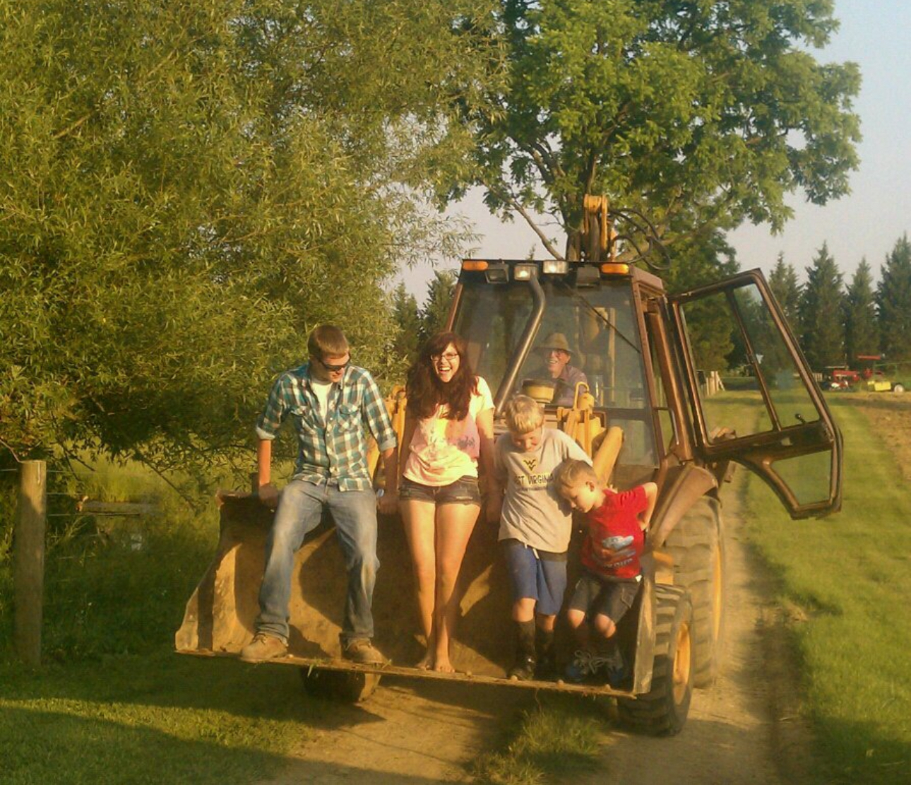 All four Young McDonalds with their grandfather driving the backhoe, circa 2008